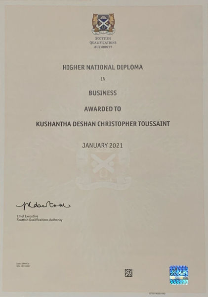 Entering his higher studies to enhance his knowledge to match the competitive business world, he starts his two-year Scottish Qualification Authority (SQA) Higher National Diploma in Business at Saegis Campus, Kohuwala. Gaining theoretical and practical knowledge through first-classed lecturers and giving out the best results he has now completed the final year of his degree program, which is BSc (Hons) Business Management via Canterbury Christ Church, Kent, United Kingdom.